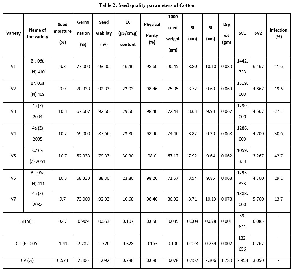 The physical purity of cotton seeds varied among different genotypes from RRTTS, Bhawanipatna (Table 1). V1 had the highest purity at 98.60%, followed by V2 and V7. The lowest purity was in V5 at 98.00%. Despite variations, all genotypes met or exceeded the minimum seed certification standard of 98.0%, ensuring the presence of physically pure seeds in each variety (Fig-1).
