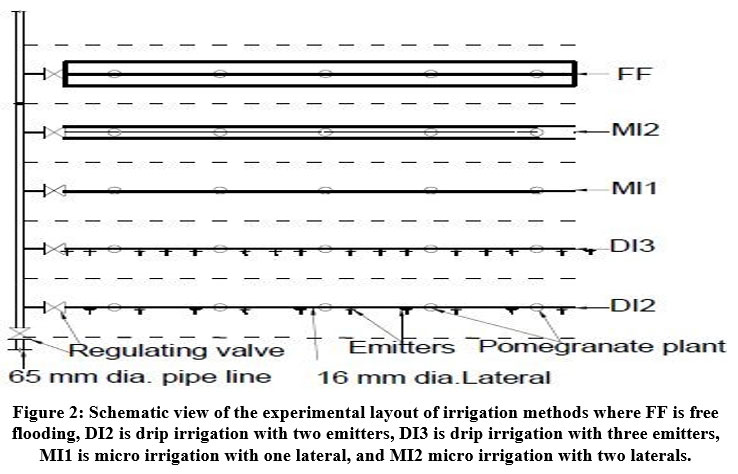 Primarily, five irrigation methods are designed and mounted in the field. The graphic view of five methods, such as FF, DI2, DI3, MI1, and MI2, is presented in Figure 2. In a pomegranate orchard, in a North-South direction, plant rows are placed with 10 plants in one row, with a 2.5-meter distance between two lines. Data from experimental results were collected from 8 plants; one plant of each side is considered a border plant. The pomegranate plant is trained as one main stem and five to six sub-branches. Maximum plant height is controlled up to 2.1 meters for the convince of spraying and labor activity. Observations of the experiment are recorded for five different irrigation methods. Moisture level is supervised in 30 cm and 60 cm penetration, at location of the same location.