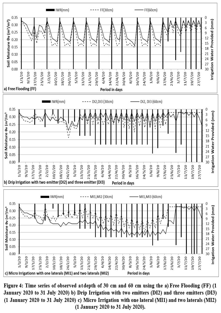 According to Figure 4, the FF irrigation method shows a sudden increase in moisture level at 30cm and 60cm depth because of the instant release of water. Whereas, in the DI2 and DI3 methods, the moisture level has observed always higher at 60 cm. It means the moisture level is maintained in the DI3 and DI2 methods. In the MI1 and MI2 methods, moisture at 60cm depth is always observed to be lower as compared to 30cm depth. Water always reaches the top root zone. Surface evaporation losses are higher in MI1 and MI2 systems. It is mainly because the surface of the Earth contact with sunlight and air, hence the evaporation rate is always high at the surface of the Earth as compared to the deep portion of the Earth.20