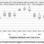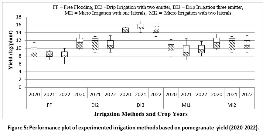 Figure 5: Performance plot of experimented irrigation methods based on pomegranate yield (2020-2022). |