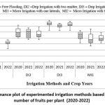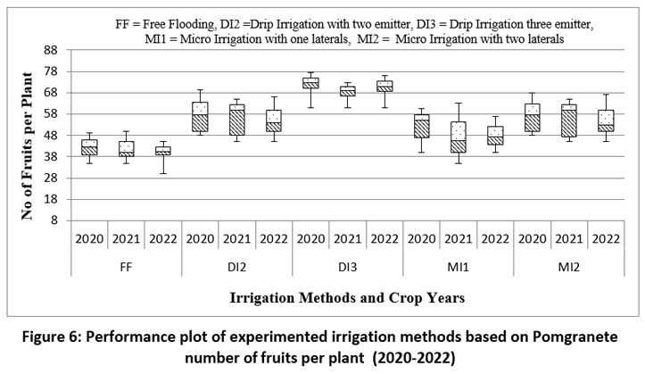 Figure 6: Performance plot of experimented irrigation methods based on Pomgranete number of fruits per plant (2020-2022). |