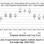 From the box plot, as shown in Figure 8, the DI3 method is showing the highest water productivity as compared to all other methods and observes 55 to 64% more pomegranate fruit weight as compared to the FF method, which is commonly used as the irrigation method in the study area during 2020-22. In the experimental period (2020–2022), the MI2 approach exhibits 22–31% greater water productivity than the FF method. In comparison to the FF approach, the DI2 method exhibits 20 to 29% greater water productivity during the research period (2020–2022). Water productivity of pomegranate plants depends upon the frequency of irrigation according to the demand of pomegranate plants.26,27 Drip irrigation with sufficient optimum irrigation fulfills the water requirement of the plant as per requirements.28,29