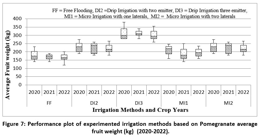 Figure 7: Performance plot of experimented irrigation methods based on Pomegranate average fruit weight (kg) (2020-2022). |