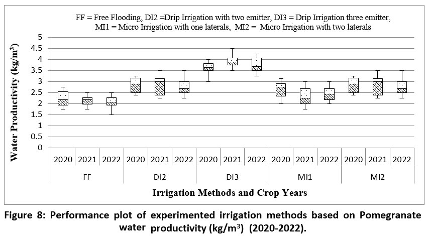 Figure 8: Performance plot of experimented irrigation methods based on Pomegranate water productivity (kg/m3) (2020-2022). |