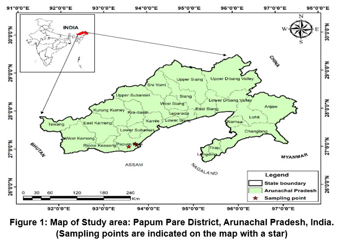 Figure 1: Map of Study area: Papum Pare District, Arunachal Pradesh, India. (Sampling points are indicated on the map with a star).