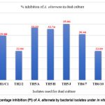 The dual culture method evaluated all isolated bacterial strains for antifungal activity. A 0.5 cm diameter fungal disc of A. alternata (72hours-old culture) was placed at the center of a 9 cm PDA (potato dextrose agar) plate. The dish was divided into four quadrants, and each bacterial isolate was spot-inoculated in a quadrant 2.5 cm from the fungal disc using a sterile stick and incubated in an inverted position for 72 hours at 28±2°C and monitored every 12 hours. Strains that inhibited fungal growth were selected and preserved 19