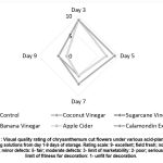 In terms of the visual quality rating and storage vase life as shown in Fig. 1 and Fig. 5, chrysanthemum cut flowers subjected to calamondin extract (10 ml/1 L of water), coconut vinegar (10 ml/L of water) and sugar cane vinegar (10 ml/L of water) as hydrating solutions obtained the longest day where it reached VQR 3 (limit of marketability) at 10 days of vase life storage, while chrysanthemum cut flowers treated with no application (control), apple cider vinegar (10 ml/L ot water) and banana vinegar (10 ml/ L of water) observed to have the shortest days where it reached VQR 3 (limit of marketability) at 7 days of vase life storage. Moreover, it was also investigated that samples subjected to treatment control (without application), apple cider vinegar, coconut vinegar and banana vinegar resulted in attaining VQR 2 that verbally described with poor and serious defects at 10 days of vase life storage compared to chrysanthemum cut flowers treated with calamondin extract and sugarcane vinegar where most of lot samples retained its marketable features (VQR 3-limit of marketability).