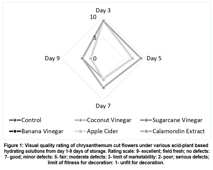 The results and findings of the study revealed that the different acid based hydrating solutions significantly affected the vase-life of chrysanthemum cut flowers during 9 days of storage. Among the data parameters evaluated, calamondin extract and sugar cane vinegar diluted in water (10 ml/ L of water) in hydrating solutions were potentially observed in slowing down the process of senescence of harvested cut flowers resulting in longer retention of marketable value and good qualitative traits under vase-life storage. Moreover, in terms of the percentage weight loss, chrysanthemum cut flowers subjected to calamondin hydrating solution observed to have the least percentage weight loss compared to other treatments. With all the correlating studies and results of the experiment, it can be recommended to use calamondin extract and sugar cane vinegar as hydrating based water-solution for prolonging the vase-life of chrysanthemum cut flowers. Moreover, identified acid-plant based hydrating solutions (calamondin extract) can be an alternative solution to be used compared to using other chemical hydrating solutions for extending the vase-life of cut flowers. Furthermore, the results of the study will benefit the chrysanthemum growers, enthusiasts, wholesalers and retailers and other researchers that would like to validate the effects of these acid-plant based hydrating solutions in other cut flowers.