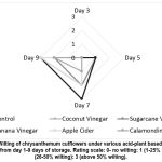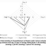 Other parameters observed such as wilting (Fig. 2), discoloration (Fig. 3) and neck bending (Fig. 4) of chrysanthemum cut flowers subjected to various hydrating solutions using calamondin extract (10 ml/L of water) and sugar cane vinegar (10 ml/L of water) hydrating solution for chrysanthemum cut flowers showed slowing deterioration of samples where it reached 26-50% wilting, discoloration and bending at 9 days of vase life storage compared to other cut flowers subjected to without application (control) banana vinegar (10 ml/L of water), coconut vinegar (10 ml/L of water), apple cider vinegar (10 ml/L of water) where it immediately reached 50% above discoloration, wilting and neck bending at 7 days of vase life storage. The results indicate that the application of calamondin extract, and sugar cane vinegar diluted in 1 L of distilled water showed promising results in delaying the senescence and extending the shelf life of chrysanthemum cut flowers based on the results of the data evaluated.