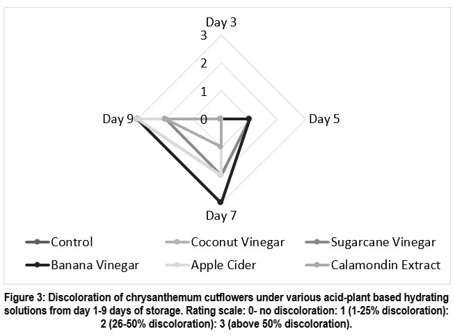 Figure 3: Discoloration of chrysanthemum cutflowers under various acid-plant based hydrating solutions from day 1-9 days of storage. Rating scale: 0- no discoloration: 1 (1-25% discoloration): 2 (26-50% discoloration): 3 (above 50% discoloration).