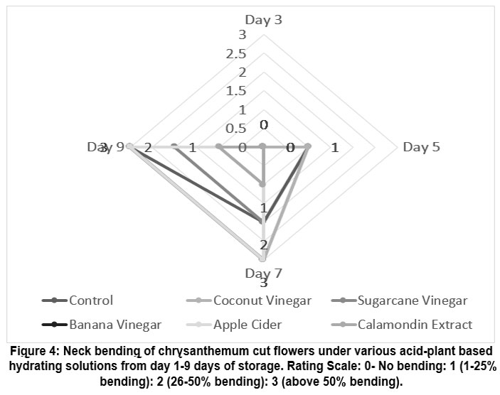 Figure 4: Neck bending of chrysanthemum cut flowers under various acid-plant based hydrating solutions from day 1-9 days of storage. Rating Scale: 0- No bending: 1 (1-25% bending): 2 (26-50% bending): 3 (above 50% bending).
