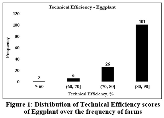 Figure 1: Distribution of Technical Efficiency scores of Eggplant over the frequency of farms.Click here to view Figure |