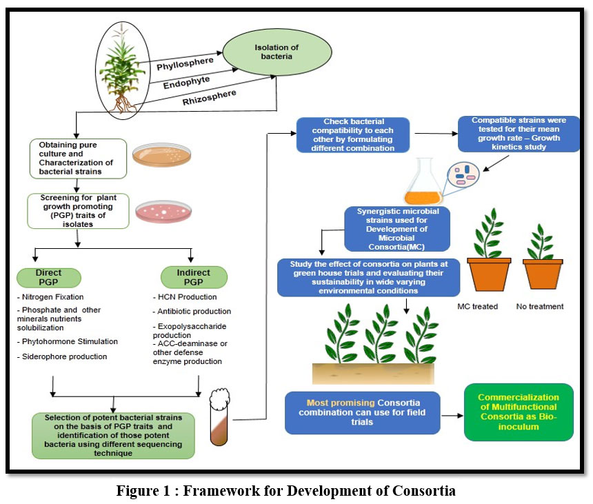 A step towards a greener economy led to the application of combined microbes as a promising strategy to give efficient yield and quick results. Construction of plant growth promoting microbial consortia is achieved by isolating microbes from the natural habitat mainly from rhizosphere and they are evaluated for the desired traits and ability for coexistence in the lab as well as on the host plant (figure 1). The mutual partners of microbial consortia may vary based on its specific application, purpose and also on host plant specificity.