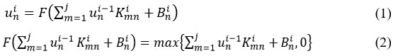 Here, uni represents the output feature map from the (n -1)th convolutional layer, and uni-1 denotes the input feature map from the (n -1)th convolutional layer. The symbol m indicates the number of convolutional layers, k is the convolution kernel, B is the bias term, and F(.). refers to the activation function (ReLU in this work). Where j is the number of input feature vectors and n is the system’s size.