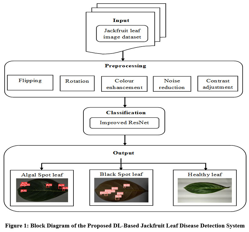 Jackfruit leaf disease detection involves the identification and classification of diseases affecting jackfruit leaves using computational techniques, particularly DL models. The main objective of the suggested method is to develop an automated DL-based system that can accurately and efficiently classify various jackfruit leaf diseases. The methodology consists of two key stages: preprocessing and classification. In the preprocessing stage, input images are subjected to various techniques, including flipping, rotation, noise reduction, contract adjustment and color enhancement. These techniques broaden the dataset’s diversity and aid in the model’s generalizedbetter by simulating different variations of leaf images. Finally, in the classification stage, an improved ResNet architecture is employed to perform the disease classification. ResNet has been improved by adaptively recalibration of channel-wise feature responses. This enables the network to concentrate more efficiently on important features, hence increasing the accuracy of classification. The block diagram (Figure 1) depicts the general workflow of the suggested strategy and each technique used in the respective stages is discussed in detail in the subsequent sections.
