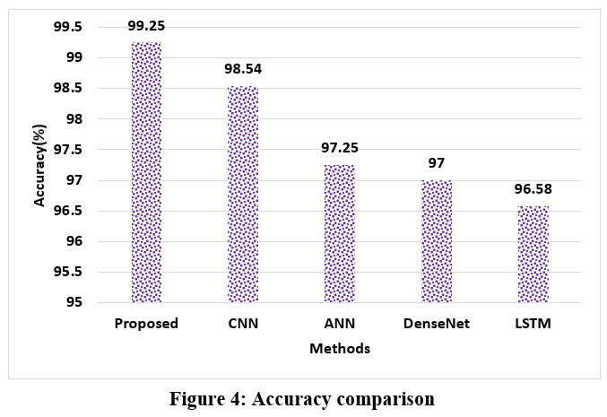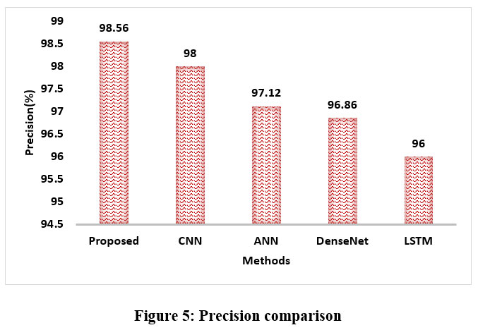 The precision performance of the suggested enhanced ResNet classifier is shown in Figure 5, underscoring its superiority over current methods. The enhanced ResNet outperforms conventional techniques like CNN, ANN, DNN, and LSTM, which attain precision scores of 98%, 97.12%, 96.86%, and 96%, respectively, with a greater precision of 98.56%. These outcomes unequivocally show that the model has improved its capacity to generate predictions that are more accurate.