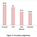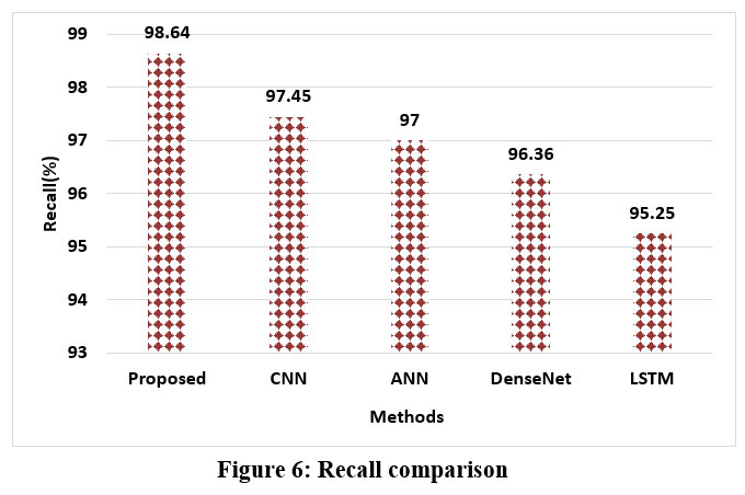 Figure 6 shows the suggested improved ResNetclassifier’s recall performance. The improved ResNet model beats conventional methods such as CNN (97.45%), ANN (97%), DenseNet (96.36%), and LSTM (95.25%) with a sensitivity of 98.64%. This substantial improvement highlights the improved ResNet can identify jackfruit leaf disease in comparison to traditional models.