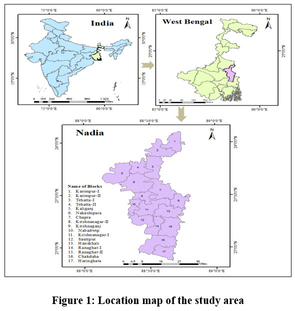 Nadia district, located in the southeastern part of West Bengal, (Figure 1), covering an area of approximately 3,927 sq. km. It is strategically bordered by Bangladesh to the east, Murshidabad district to the north, North 24 Parganas to the south, and Hooghly district to the west, giving it a pivotal geographical position. The Ganges River, considered the lifeline of the region, flows along its western and northern boundaries. With its fertile alluvial soil, abundant water resources, and proximity to major river systems, Nadia district is highly suitable for agriculture and holds significant potential for sustained agricultural development.
