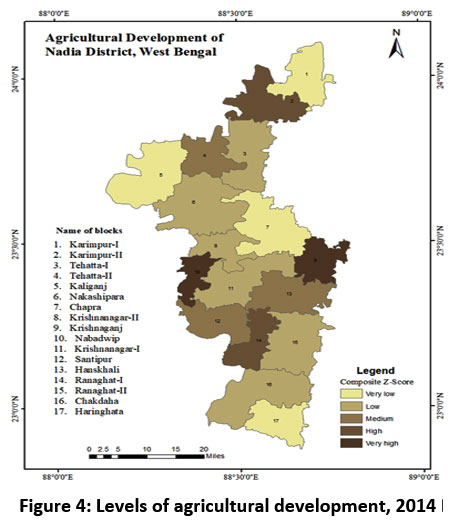 The development of agricultural sector means the development of rural area and further leading toward rural conversion.13 Sustainable agricultural development is a complete and balanced process that depends on several factors such as crop productivity, crop diversification, and agricultural efficiency. The level of agricultural development in Nadia varies from block to block because of differences in natural and human factors affecting farmland. It is influenced by many related elements, including fertile soil, human labor, use of unused cultivable land, farm mechanization, proper planning, and crop productivity.14 The impact of various government schemes, such as Krishi Vigyan Kendras (Agricultural Science Centers) and subsidies on inputs on farmer livelihoods and productivity.15