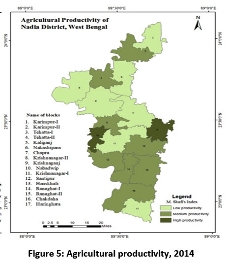 Agricultural productivity in Nadia District was assessed using M. Shafi’s formula, which evaluates the output of agricultural production in relation to the inputs used, such as land, labor, and capital. This formula takes into account the total yield of crops per unit of input, providing an efficient measure of how effectively the agricultural resources are being utilized. By calculating productivity, it helps in understanding the efficiency of farming practices, the impact of technological advancements, and the overall performance of the agricultural sector in the district. High agricultural productivity indicates successful resource utilization and potentially higher farmer incomes, while lower productivity could suggest the need for improvements in farming techniques, infrastructure, or input use.