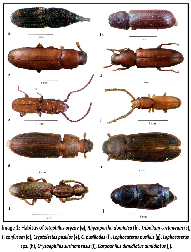 Image 1: Habitus of Sitophilus oryzae (a), Rhyzopertha dominica (b), Tribolium castaneum (c), T. confusum (d), Cryptolestes pusillus (e), C. pusilloides (f), Lophocaterus pusillus (g), Lophocaterus spp. (h), Oryzaephilus surinamensis (i), Carpophilus dimidiatus dimidiatus (j).