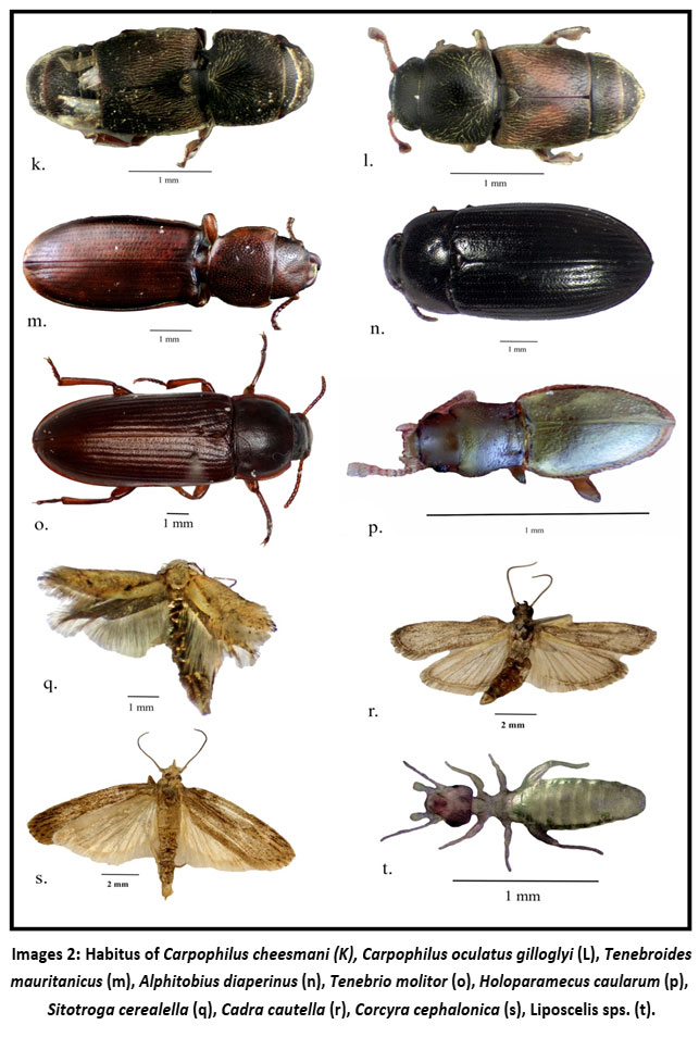 Images 2: Habitus of Carpophilus cheesmani (K), Carpophilus oculatus gilloglyi (L), Tenebroides mauritanicus (m), Alphitobius diaperinus (n), Tenebrio molitor (o), Holoparamecus caularum (p), Sitotroga cerealella (q), Cadra cautella (r), Corcyra cephalonica (s), Liposcelis spp. (t).