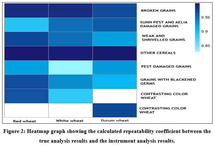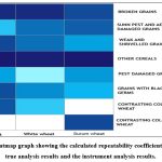 The repeatability coefficients (intraclass correlation coefficients) between the true analysis results and the instrument analysis results for the following fragments in red wheat, white wheat, and durum wheat; broken grains, sunn pest and aelia damaged grains, other cereals, grains with blackened germs, weak and shrivelled grains, pest-damaged grains, contrasting colored wheat (in common wheat), and nonvitreous grains (in durum wheat) were calculated in Table 4.