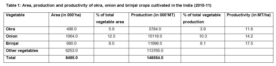 Table 1 Table 1: Area, production and productivity of okra, onion and brinjal crops cultivated in the India (2010-11).
