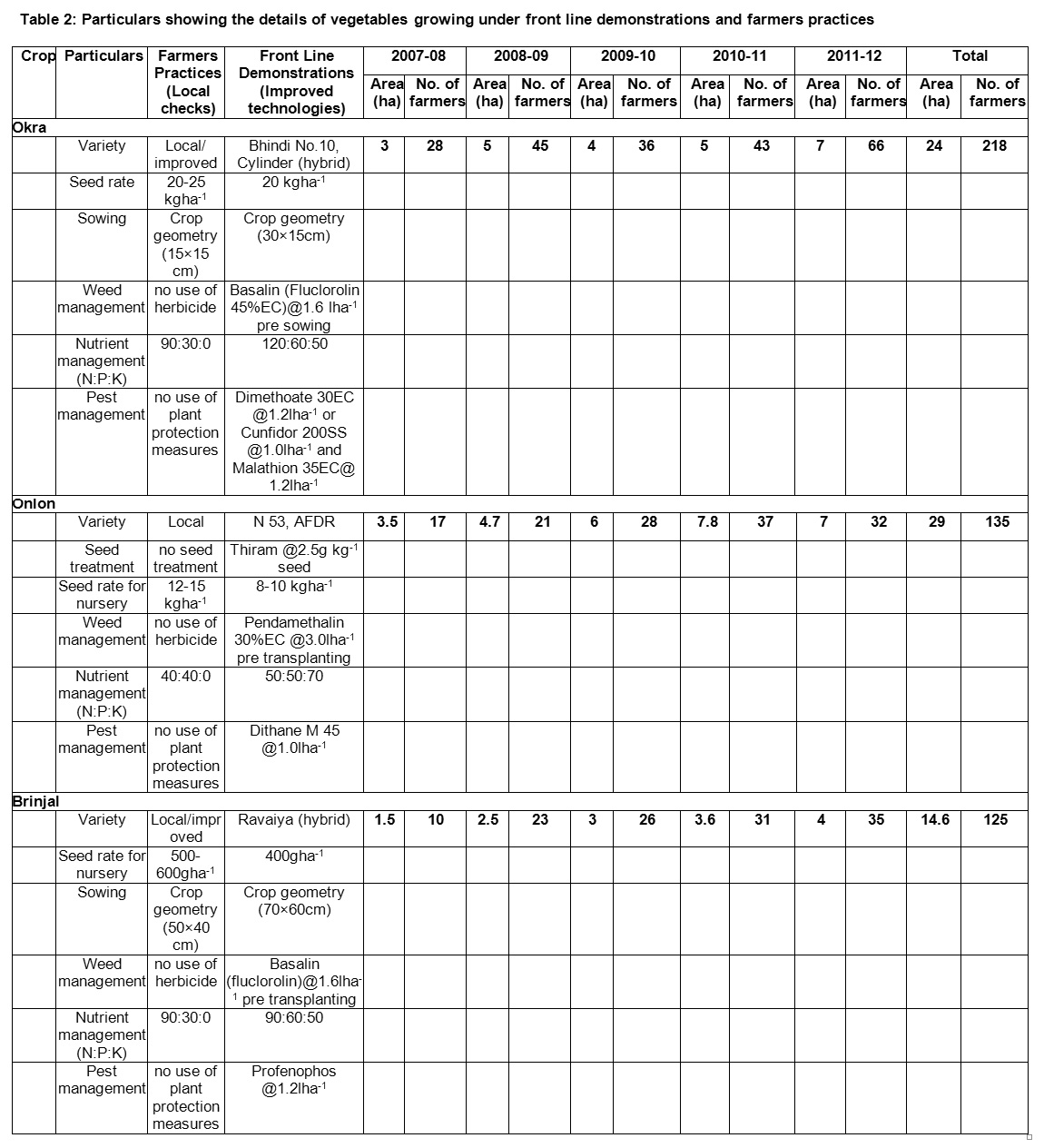 Table 2 Table 2: Particulars showing the details of vegetables growing under front line demonstrations and farmers practices.