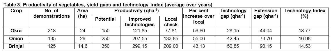 Thus, the cultivation of vegetable crops with improved technologies including suitable varieties, weed management, nutrients and pest management has been found more productive and fruit yield in okra, onion and brinjal was increased up to 56.60, 55.06, and 43.13 per cent, respectively. Technological and extension gaps existed which can be bridged by popularizing package of practices with emphasis on the seed of improved vegetable hybrid varieties, use of proper seed rate, balanced nutrient application and proper use of plant protection measures. Replacement of local varieties with the released hybrid varieties of okra, onion and brinjal would increase the production and net income of these vegetable crops.