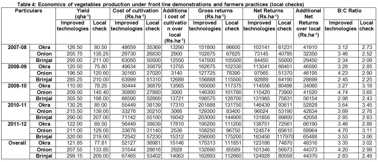 Table 4: Table 4: Economics of vegetables production under front line demonstrations and farmers practices (local checks).