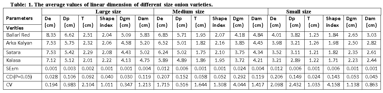India place world’s second most largest producer of onion (AlliumcepaL.) and China being at top followed by USA, Turkey, Pakistan, Iran, Indonesia, Vietnam and Myanmar. India produces about 13 per cent of total world’s onion product and ranked second after China. In India 1.0 million hectare (mha), onion is grown with the production of 15.1 million tones (mt) and productivity of 14.2 t/ha.1 The overall onion export from India was 203 lakh tones (lt) in the year 2015-16. In India vegetable production occupies 10.5 percent and Maharashtra (28.9 %) placed highest in production.2 In Karnataka the total onion cultivation area is 1.90 lakh hectares (lha) with a production of 2.5 mt and productivity of 13.6 t/ha.2 In Koppal, agriculture is the main resource and it plays important role in the economic development of the district and has an area 14,329 ha with of onion production 49,529 mt (Anonymous, 2016) and has 24 percent share of agriculture in GDDP (Gross District Domestic Product). The knowledge of physico-mechanical properties of onion are required for (a) cleaning, grading and sorting machines design (b) prediction of total surface chemical applied (c) during thermal processes to depict heat and mass transfer (d) during handling process to quantify damage caused due to bruise and abrasion.
