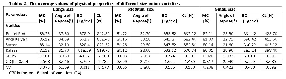 - The highest mean value of bulk density from 390.42to 678.9 kg/cm3 was observed in Ballari red onion followed by Arka kalyan 390.42 to 662.7 kg/cm3, Satara 390.23to 628.4 kg/cm3, Kalasa 385.24 to 618.59 kg/cm3 and highest mean value of angle of repose which was observed in Ballari red i.e, 37o (large size) and lowest was observed 20.90o in Kalasa (small size) variety.