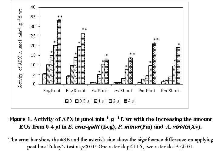 Figure 1. Activity of APX in µmol min–1 g –1 f. wt with the Increasing the amount EOs from 0-4 µl in E. crus-galli (Ecg), P. minor(Pm) and A. viridis(Av). The error bar show the ±SE and the asterisk sine show the significance difference on applying post hoc Tukey’s test at p≤0.05.One asterisk p≤0.05, two asterisks P ≤0.01. Figure 1: Activity of APX in µmol min–1 g –1 f. wt with the Increasing the amount EOs from 0-4 µl in E. crus-galli (Ecg), P. minor(Pm) and  A. viridis(Av).