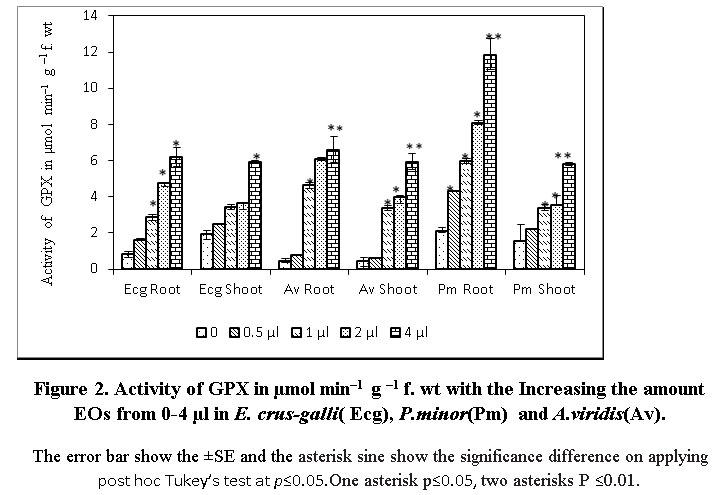 Figure 2. Activity of GPX in µmol min–1 g –1 f. wt with the Increasing the amount EOs from 0-4 µl in E. crus-galli( Ecg), P.minor(Pm) and A.viridis(Av). The error bar show the ±SE and the asterisk sine show the significance difference on applying post hoc Tukey’s test at p≤0.05.One asterisk p≤0.05, two asterisks P ≤0.01. Figure 2: Activity of GPX in µmol min–1 g –1 f. wt with the Increasing the amount EOs from 0-4 µl in E. crus-galli( Ecg), P.minor(Pm)  and A.viridis(Av).