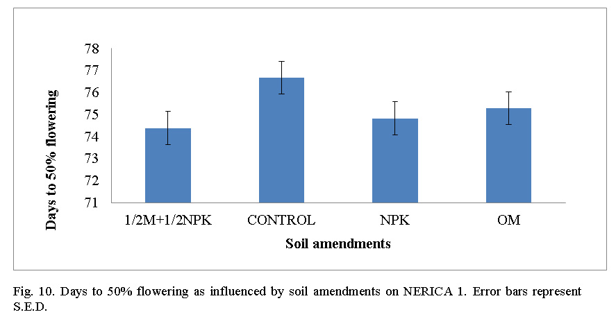 Fig. 10. Days to 50% flowering as influenced by soil amendments on NERICA 1. Error bars represent S.E.D. Figure 10: Days to 50% flowering as influenced by soil amendments on NERICA 1. Error bars represent S.E.D.