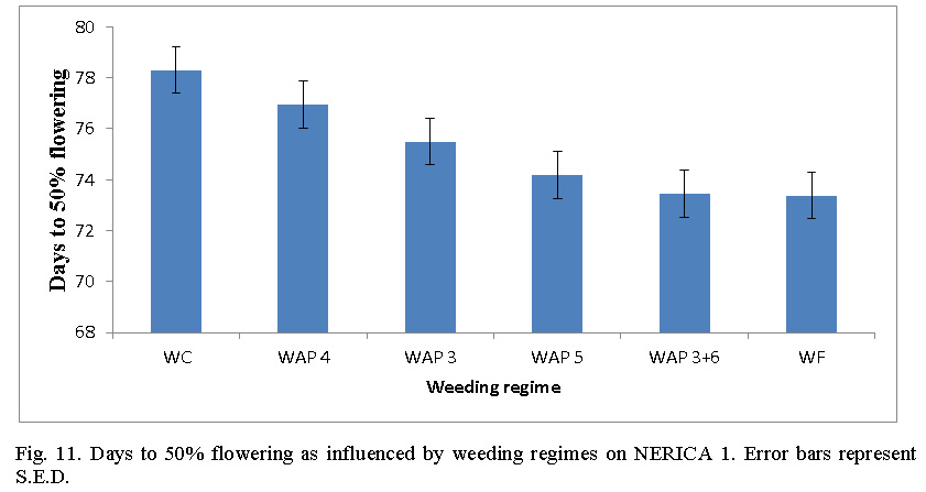 Fig. 11. Days to 50% flowering as influenced by weeding regimes on NERICA 1. Error bars represent S.E.D. Figure 11: Days to 50% flowering as influenced by weeding regimes on NERICA 1. Error bars represent S.E.D.