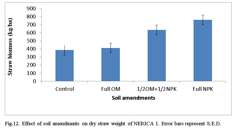 Soil amendment and weeding regime varied straw biomass significantly (P < 0.001) with maximum biomass attained with full dose of NPK followed by half doses of NPK and organic manure (Fig. 12). Notably twice weeding only reduced the parameter by 20% relative to the weed-free control (Fig. 13), making the farmer hand weeding an adequate practice to promote rice production where labour is available.