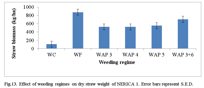 Fig.13. Effect of weeding regimes on dry straw weight of NERICA 1. Error bars represent S.E.D. Figure 13: Effect of weeding regimes on dry straw weight of NERICA 1. Error bars represent S.E.D.