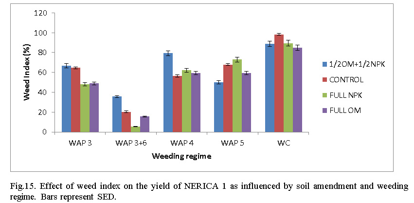 Fig.15. Effect of weed index on the yield of NERICA 1 as influenced by soil amendment and weeding regime. Bars represent SED. Figure 15: Effect of weed index on the yield of NERICA 1 as influenced by soil amendment and weeding regime. Bars represent SED.