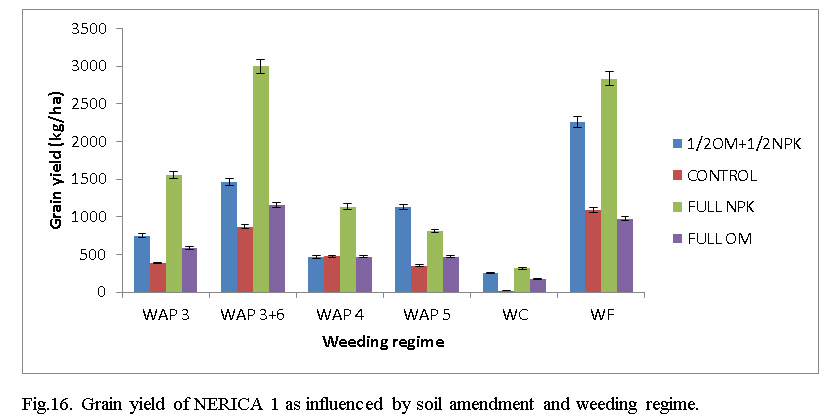 Fig.16. Grain yield of NERICA 1 as influenced by soil amendment and weeding regime. Figure 16: Grain yield of NERICA 1 as influenced by soil amendment and weeding regime.