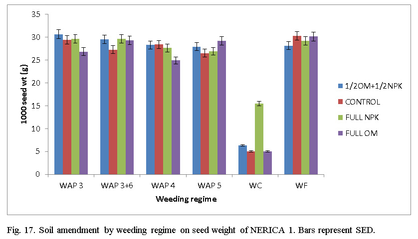 Fig. 17. Soil amendment by weeding regime on seed weight of NERICA 1. Bars represent SED. Figure 17: Soil amendment by weeding regime on seed weight of NERICA 1. Bars represent SED.