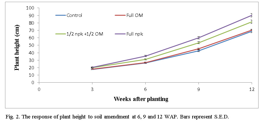 Fig. 2. The response of plant height to soil amendment at 6, 9 and 12 WAP. Bars represent S.E.D. Figure 2: The response of plant height to soil amendment at 6, 9 and 12 WAP. Bars represent S.E.D.