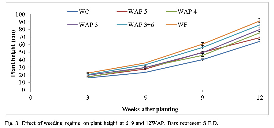 At 6, 9 and 12 WAP, weeding at 3 and 6 WAP exhibited increased plant height similar to weed free; but similar result was obtained with weeding once at 3 WAP (Fig. 3). This could probably be due to the early elimination of weeds which might have resulted in less competition during the cropping season with consequential increased availability of nutrients to the plants.