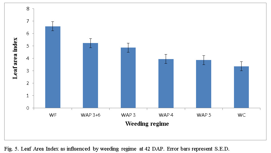 Fig. 5. Leaf Area Index as influenced by weeding regime at 42 DAP. Error bars represent S.E.D. Figure 5: Leaf Area Index as influenced by weeding regime at 42 DAP. Error bars represent S.E.D.