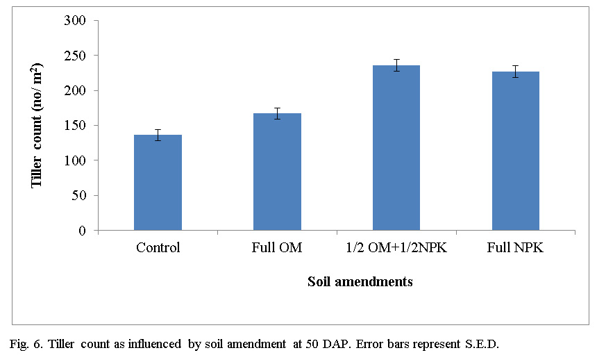 Soil amendment significantly increased tillering (P < 0.001) at 50 DAP, maximised by both  full rate of NPK and half NPK plus half ogarnic manure application (Fig. 6). Similarly, weeding regime varied tillering (P < 0.001) with weeding at 3 and 6WAP notably equalling weed free (Fig.7).