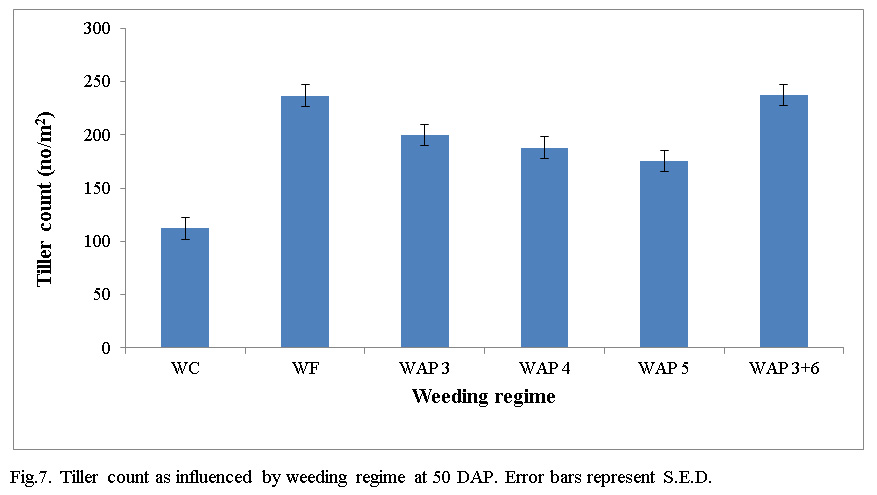 Fig.7. Tiller count as influenced by weeding regime at 50 DAP. Error bars represent S.E.D. Figure 7: Tiller count as influenced by weeding regime at 50 DAP. Error bars represent S.E.D.