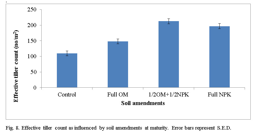 Fig. 8. Effective tiller count as influenced by soil amendments at maturity. Error bars represent S.E.D. Figure 8: Effective tiller count as influenced by soil amendments at maturity. Error bars represent S.E.D.