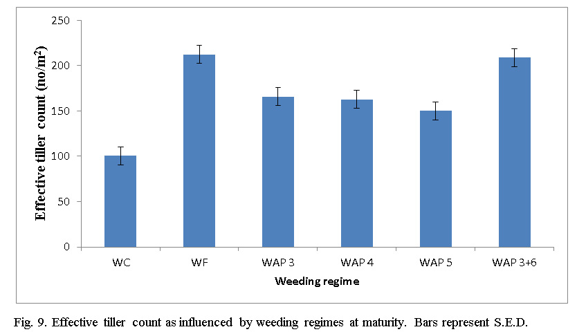 Fig. 9. Effective tiller count as influenced by weeding regimes at maturity. Bars represent S.E.D. Figure 9: Effective tiller count as influenced by weeding regimes at maturity. Bars represent S.E.D.