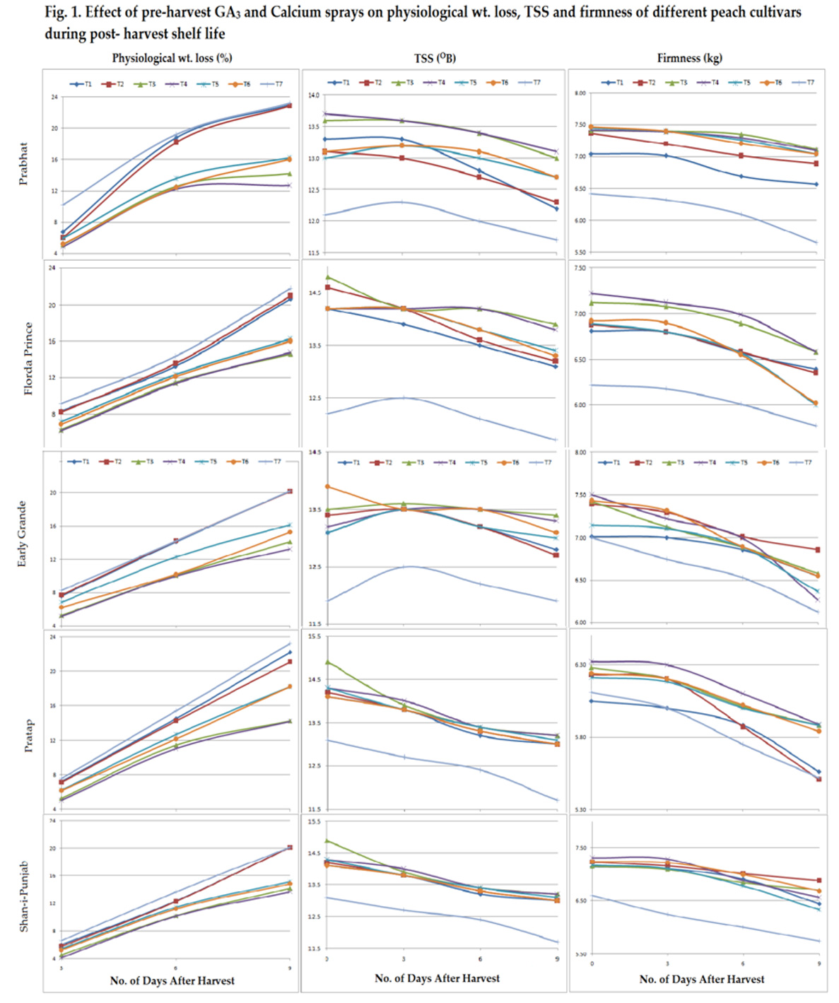 Figure 1: Effect of pre-harvest GA3 and Calcium sprays on physiological wt. loss TSS and firmness of different peach cultivars during post-harvest shelf life |